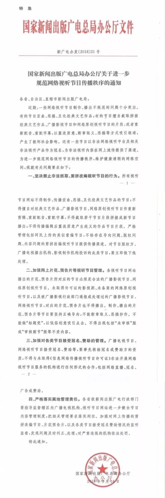 视频搬运工早晚要受到正式化、规范化的版权整治,我们也不是第一次写这种话题,所以长话短说。就在3月22日,也就是前天,广电总局下发特急文件,大概意思是“将进一步规范化网络视频的传播”,且大部分字眼主要针对“改编他人视频”。