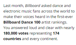 在Billboard Dance官方的介绍当中,这是针对全球Electronic Music艺人和粉丝的排名,并且收到了来自174个国家的18万张投票。也就是说,有些媒体和乐迷疯狂带节奏,说这只是一张美国榜单,仅限于美国艺人,完全就是误解。