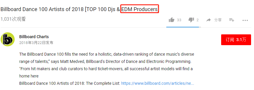虽然Billboard Dance一本正经地在宣传过程中将榜单称之为Electronic Music的艺人排名,也就是电子音乐艺人,相当于它不会仅限于某种电子音乐风格。但隔壁的“猪队友”Billboard Charts在Youtube的标题却是另一个说法。但EDM可不等于Electronic Music。
