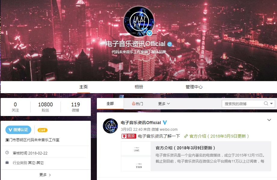 微博已经成为了QQ空间2.0,十几年前的乡村论坛3.0。N年前,我们在微博上以个人身份推广电子音乐,既发个人动态也发电子音乐动态。三年前,我们开设了《电子音乐资讯》公众号,至今输出了3000多篇原创文章。一个月前,我们开设了官方微博。