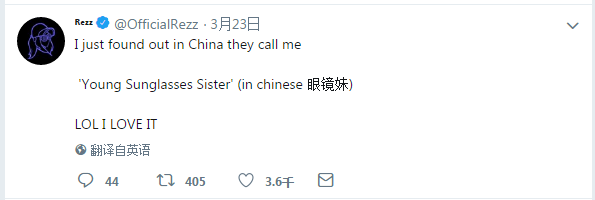 而就在3月23日,也就是三天前,Rezz在推特上翻牌了来自中国粉丝给她起的称呼,“眼镜妹”。应该是中国区Booking Agency告诉Rezz的。而Rezz刚刚发现这种说法,并且说到自己很喜欢这个名字。以后“眼镜妹”就是Rezz官方认证的中文绰号啦。