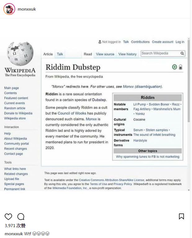 然而在几个小时以前,MONXX更是发布了一张恶搞英文维基百科的图片,可能是MONXX做的也可能只是MONXX的粉丝做的。当然这张图片完全是为了搞笑,毕竟维基百科是一个人人都可以编辑的平台,感兴趣的自己翻译一下内容,十分幽默风趣。