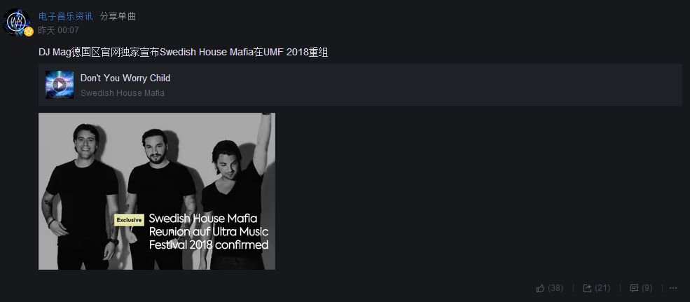 其实在这之前,包括但不仅限于我们在内,已经有海量国内外媒体公布过Swedish House Mafia会回归的事件。比较官方的还有国际大牌艺人常常合作的灯光师Charly Bendenoun、DJ Mag德国区官网、Ultra China朋友圈、某些音乐节主办方等等。