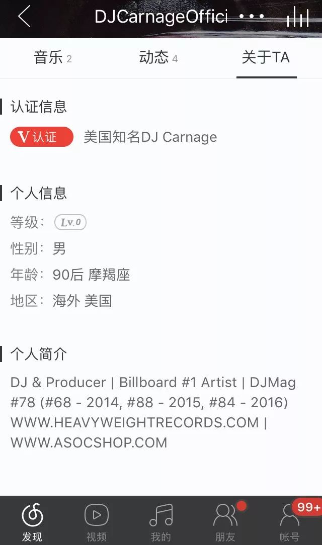 此外。Carnage在网易云音乐上的介绍标明他是Billboard排名第一的艺人。然而在现在的Billboard艺人榜单上的Top 100都没有Carnage,毕竟该排名具有时效性,但Carnage并没有说明时间。反正这看起来像是个噱头和误导,跟王绎龙差不多。