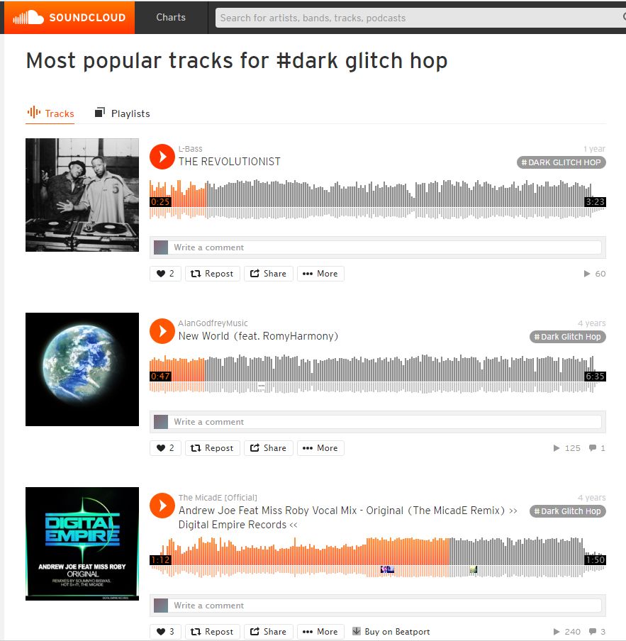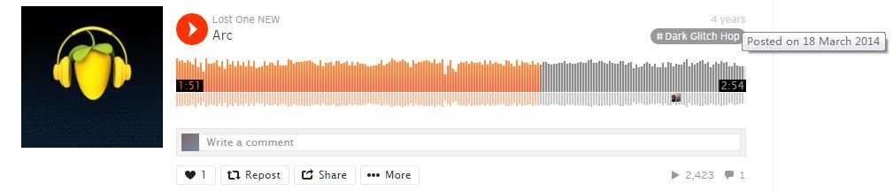 先看Soundcloud上的音乐风格标签Dark Glitch-Hop当中的曲目吧。在Soundcloud上最早被艺人打上Dark Glitch-Hop的应该是Lost One NEW的《Arc》。虽然音乐质量不及Rezz之高,但是一听就能听得出浓郁的“Rezz风”。