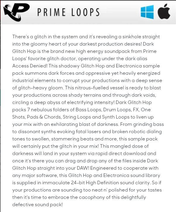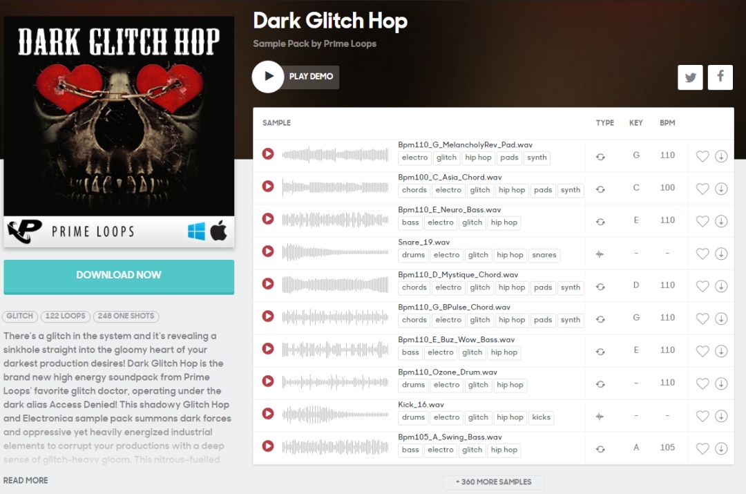 一直到2015年,Splice Sounds和Prime Loops终于发布了全世界第一个Dark Glitch-Hop素材包,也就是Sample Pack。这个素材包包括了122个Loops和240个One-Shots,所有音色都面向Dark Glitch-Hop,当然你也可以在很多Glitch-Hop曲目里听到它们。
