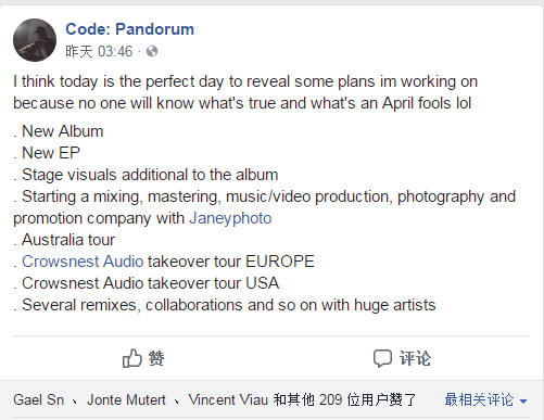 就在昨天,Code:Pandorum预告了接下来的工作目标,其中包含“新专辑、新EP、新Visuals、开创集混音,母带,音乐制作,视频制作,拍照,推广为一体的公司、澳洲巡演、厂牌欧洲巡演、厂牌美国巡演、各种Remix以及与大牌艺人的合作”。