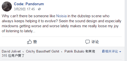 而在前几天,Code:Pandorum还吐槽了自己对Dubstep现状的不满。认为没有多少人能像Noisia那样保持推广Dubstep场景,现在的Dubstep作品的音色设计和后期混音实在搞得他不想听这些东西。