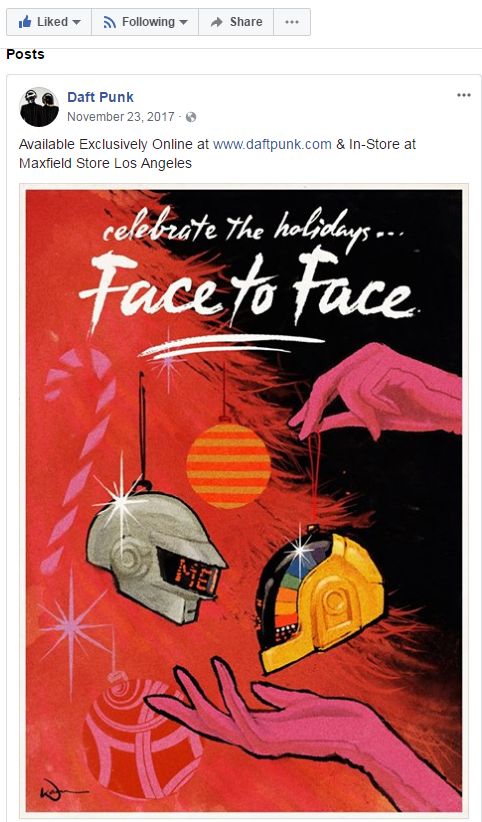 可自从2017年11月23日以后,Daft Punk再也没有更新过任何动态。虽然他们的Instagram动态比Facebook少,但2017年11月23日的这条动态恰好也是目前为止他们在Instagram的最后一条动态,在Facebook比在Instagram活跃成为过去式。至于推特?他们已经很多年没有碰过。