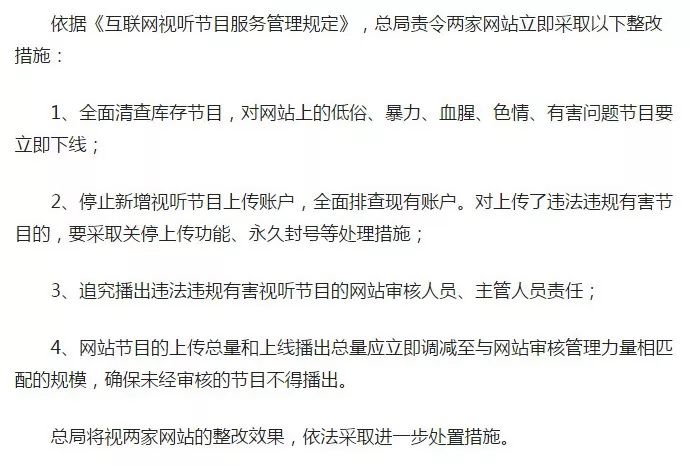 2018年4月4日,国家广播电视总局正式对互联网发布通告,将对今日头条和快手进行严厉整治,主要面对平台内有违背社会道德的相关内容。除了今日头条与快手被点名批评以外,其它相关平台同样有可能成为下一个管制的目标。