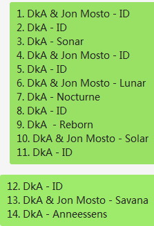 DkA成为我们电台的第二位嘉宾,为我们送上了Techno/Tech House之旅,以及带你专研更多Techno/House的子风格的无尽可能性。不仅全程都是DkA自己的作品,而且含有大量的ID,具体的播放列表也就是Playlist,参见下图。