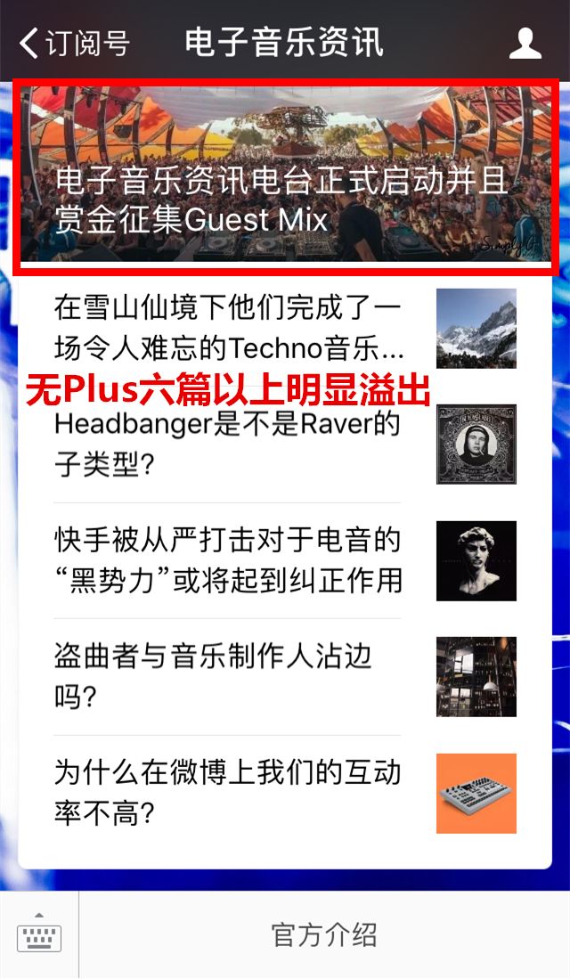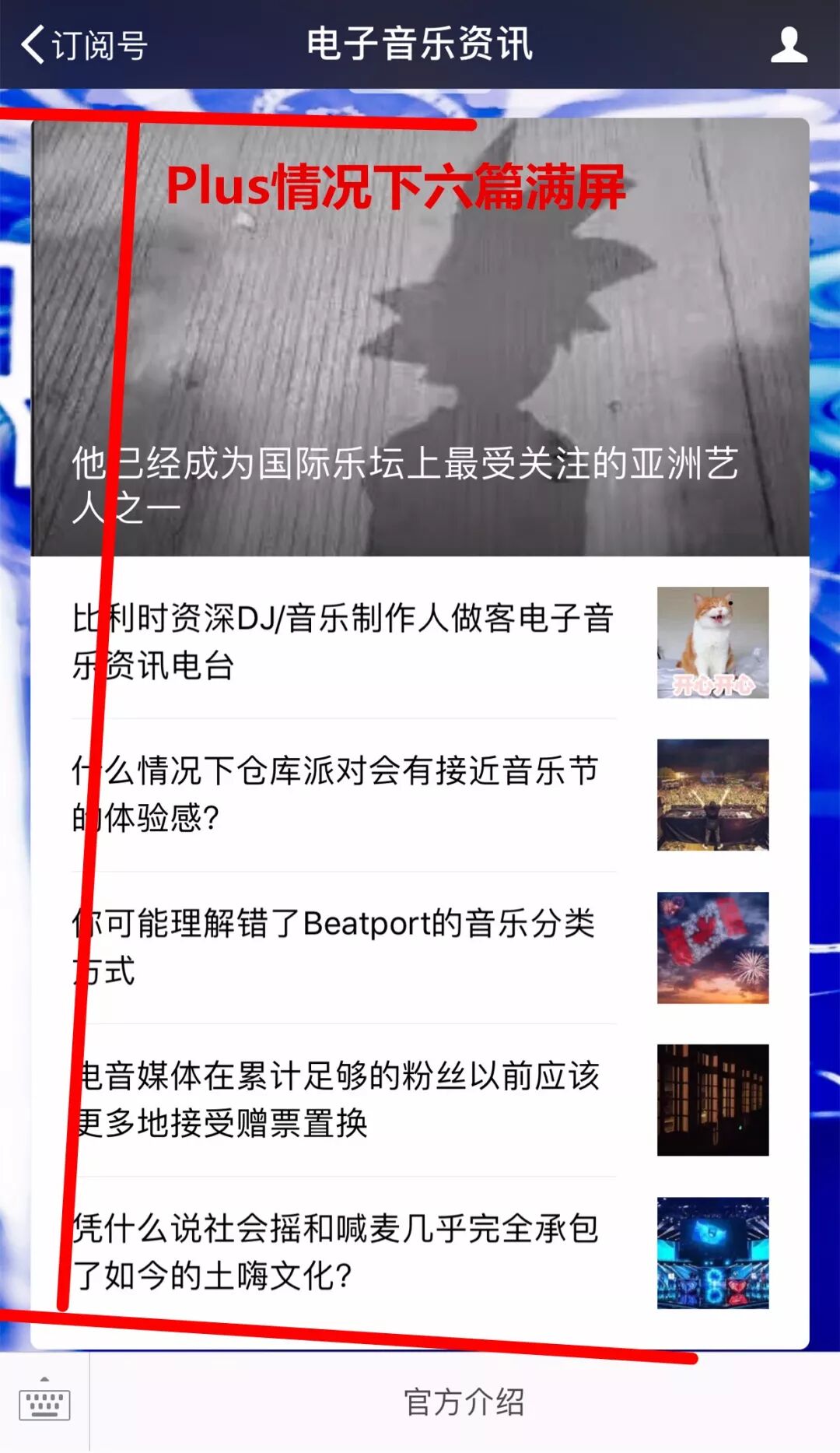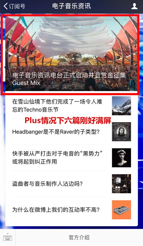 但如果你的手机型号带有Plus,这个问题会被解决。公众号的运营者不再需要过于顾虑6篇以上文章会造成显示溢出,大部分读者错过溢出的篇幅。如果需要下拉才能看到更多文章,读者们也许并没有下拉的习惯。