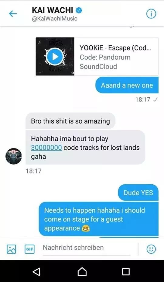 然而,就在前几天,音乐风格Orchestral Deathstep代表人物和创始人Code:Pandorum向Kai Wachi发送私信,自荐了他的最新曲目。这首新曲目得到Kai Wachi赏识,并且公开提出要在Lost Lands播放很多Code:Pandorum的东西。