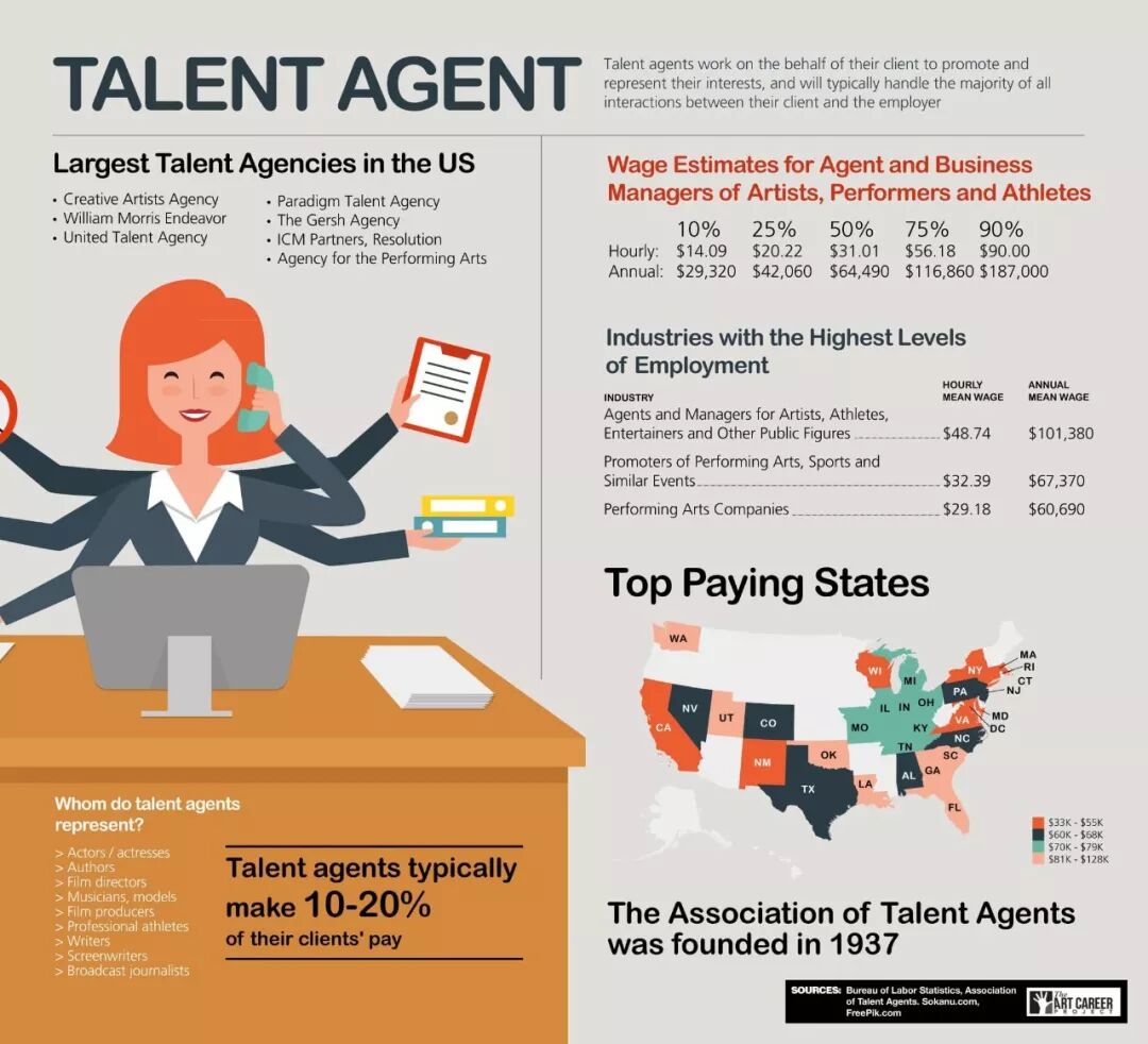 Talent Agency约等于Booking Agency,从某种程度上来说甚至是一回事,但有时候Talent Agency的范围可能会更广一些。Talent Agency不仅可以管理艺人的演出,还可以为更多行业的从业者提供机会,例如为演员接拍摄、接广告等等,请自行举一反三。