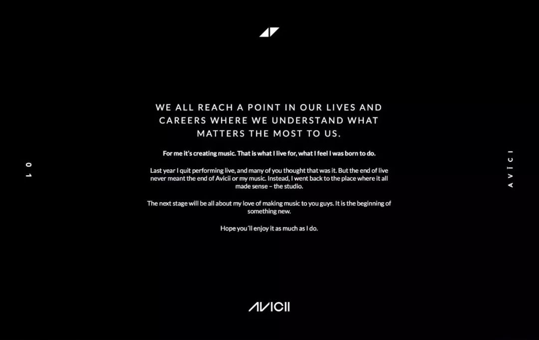 至于Drugs这个说法,完全没有依据,Avicii失去了健康,但他并不是一位Addict。没有人知道,Avicii满怀正能量地在离开世界以前做完他的最后一张专辑,然后发了动态却又将其删除。既然已有回归演出的安排,可能Avicii也没有想到这一切会来得这么突然。