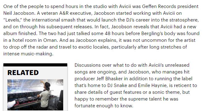 换而言之,Avicii可能在4月19日完成了他最新专辑的最后一部分,并且把这张专辑交给了厂牌Geffen Records A&R筹划发布,然后飞向阿曼,永远地离开了我们。这根本是完全戏剧化的场景,谁也没想到它真的发生了,甚至不把最后一条动态永久地保留下来。