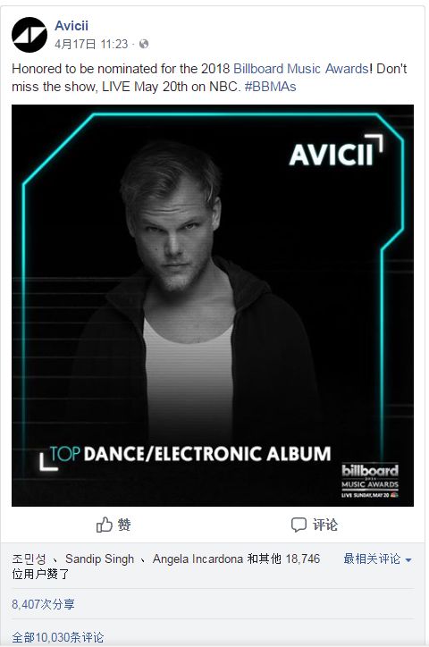 2018年4月17日,Avicii在Facebook上宣布获得2018年Billboard Music Awards的提名,并且5月20日会在美国全国广播公司NBC进行演出。这也意味着Avicii原本计划在一个月后复出演出,时隔2016年3月宣布完全退出演出已有两年以上之久!
