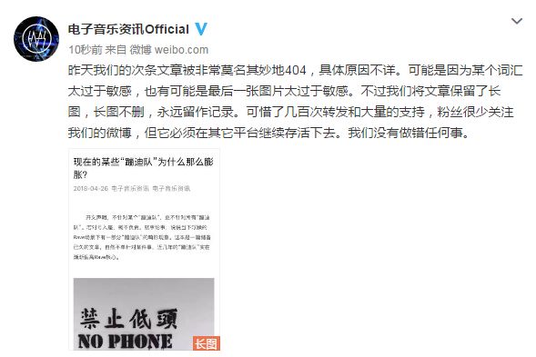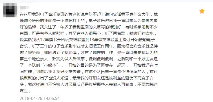 我们十分珍惜关注我们的所有粉丝,每个人都是我们的一部分。我们不愿意撕逼,不想跟任何人树敌。三年以来,我们日日不间断地全职投入到电子音乐文化的输出工作当中。但是倘若我们不反击,只会让更多人有可乘之机,最终毁掉每个人最爱的净土。