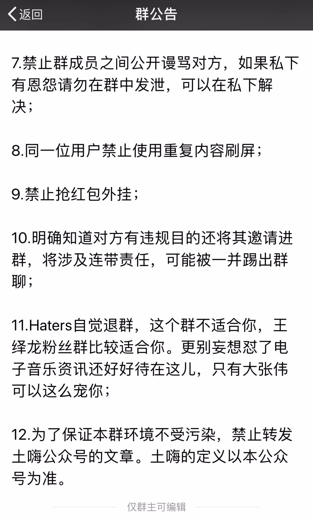 既然你进入了我们的官方群,是不是有义务看看群公告呢?如果此前没有看过我们的群公告,是不是你的问题呢?所以这种自认电音圈龙头老大的人是怎么想的?发了一篇目的性极强的怼我们的文章,我们不应该把你踢出群聊?真把自己当成规矩啦?