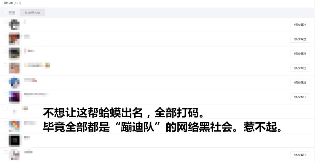 再绕回那位“队长”被踢出群聊的问题。其实原因真的很简单,在我们将你踢出群聊的前一天,我们便已经看到你那篇为几家“蹦迪队”说话的文章,并且立刻查询得知你就是对应公众号所谓的“蹦迪队”的所谓的“队长”,和平地将你拉入了公众号的黑名单。