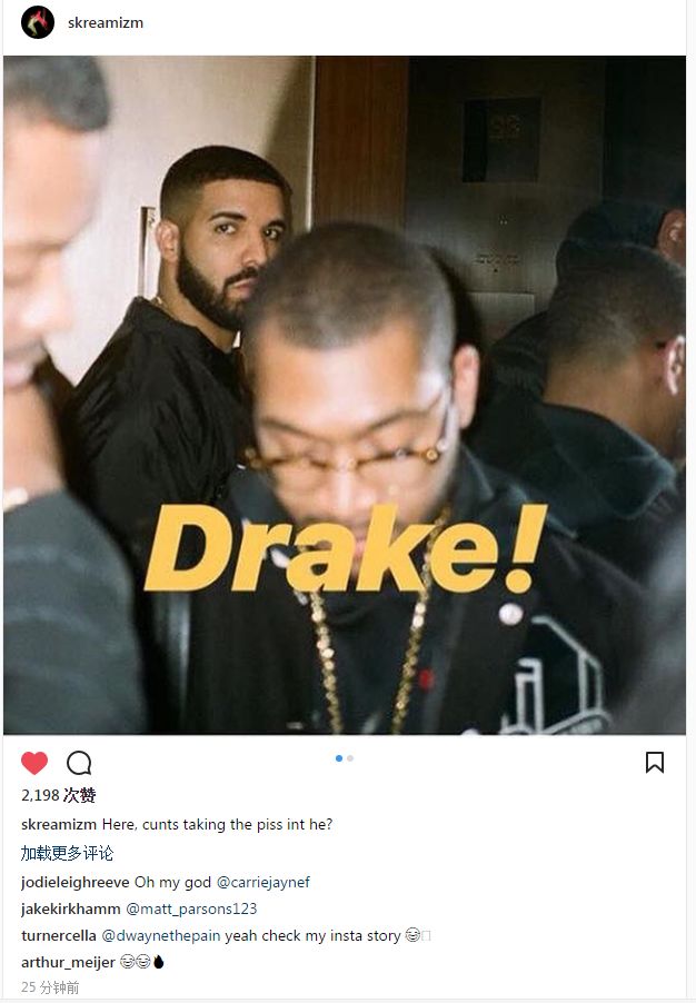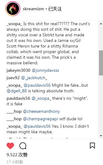 所以这种问题,怎么站边都没有说服力。不排除Skream真的有点儿小题大做,在Skream的Instagram配文中,那句话是俚语里很脏的骂人的句子,你能在中文里想到的各类脏话差不多也就那么个意思。目前为止,Drake没有做出任何回应。