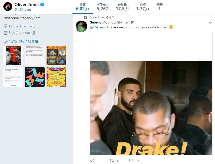 Skream似乎并没有太注意Drake的动态,而是在他的粉丝于推特上At他以后才发现了这件事。Skream也认为这是难以置信的。“这张照片看起来太眼熟了”。Skream在推特转发了这条粉丝动态,以向大家展现他为什么知道了这件事。