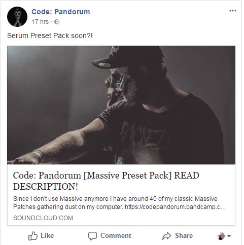 就在昨天,Code:Pandorum在Facebook上预告,他即将发布Serum预制包,也就是Preset Pack,这会是一个应用于血清合成器插件Serum上的Deathstep顶级软音源。在Code:Pandorum亲自设计的素材呈现以后,定然会影响到更多制作人的作品。