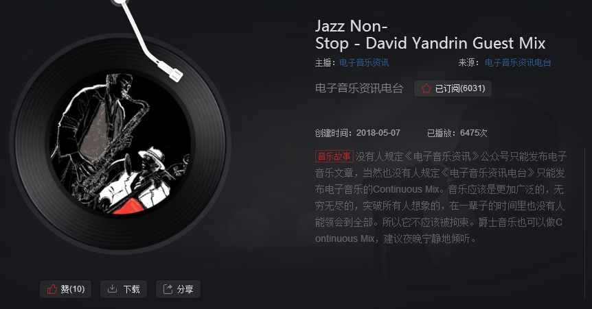 就在昨天,《电子音乐资讯电台》发布了第一期不属于电子音乐的Continuous Mix,也意味着大张旗鼓告诉大家,我们从未告诉你这个品牌仅限于电子音乐,只是以电子音乐为主。这期Continuous Mix采取爵士音乐风格,带给你极佳的Jazz不停的高雅环境。
