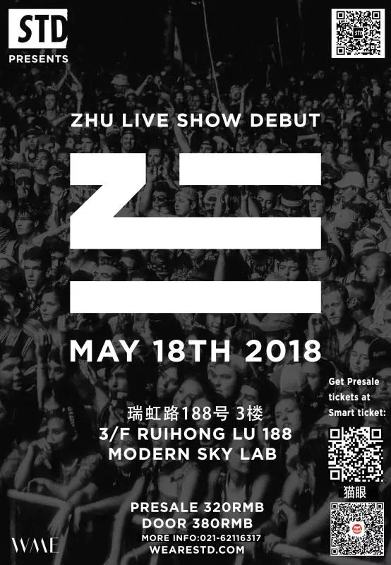 这次呈现Zhu全乐队Live Set的主办方是在上海有一定人气的STD,他们总是在上海举办着高质量的音乐派对,带来各路国际上的音乐之星,与上海至其它城市的Live House或者Club达成合作并就地举办。若想获取更多STD举办的派对信息,快扫码关注他们。