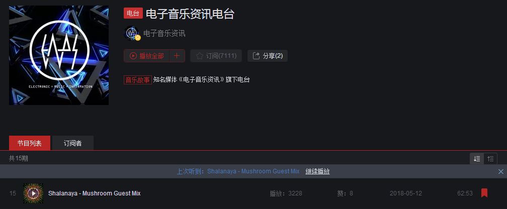 找到它的方式很简单。打开你的网易云音乐客户端,在“主播电台”那儿搜索《电子音乐资讯电台》,有且只有一个结果,除非未来有人冒充我们。开启你看到的最新电台节目《Shalanaya - Mushroom Guest Mix》,享受62分钟迷幻恍惚之旅。