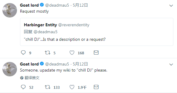 不仅如此,Deadmau5还在推特上号召粉丝,希望有人帮他修改一下维基百科,在维基百科上将他介绍为一位Chill DJ。有粉丝问他,“这是已有的描述还是请求?”,Deadmau5则转推告诉了更多粉丝,说明这是一个”主动请求”。