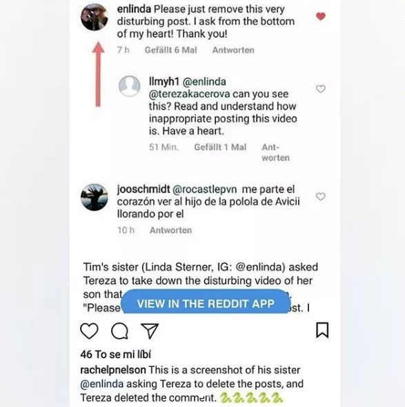在此之后,还有西方网友扒出Avicii的姐姐Enlinda要求Tereza Kačerová删除这些东西,因为这些东西实在让她心碎。没有任何攻击性并且有理有据。而在明知Enlinda是Avicii的姐姐的情况下,Tereza Kačerová选择删除了Enlinda的评论,并且置之不理,让人更加怀疑Tereza Kačerová的用意。