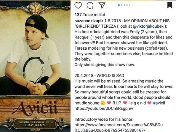 先回顾一下此前发生了什么。北京时间2018年4月27日,一名自称“Avicii女朋友”的网友在Instargam引人注目,引起Avicii粉丝圈的巨大轰动。这名女网友是一名模特,名为Tereza Kačerová。虽然她有理有据地晒出了大量与Avicii的合照,但是……