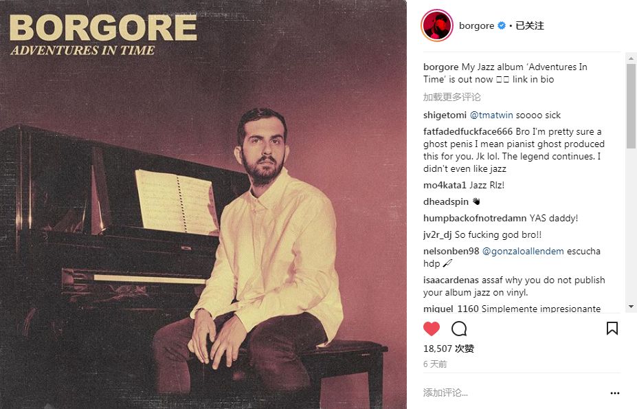 2018年5月9日,Borgore发布了他的爵士音乐专辑《Adventures In Time》。此举动摧山搅海、轩然大波,评论区粉丝纷纷表示很惊讶,怎么也想不到Borgore会尝试Jazz Music。但也有一些外国杠精,认为Borgore一定是雇佣Ghost Producer完成这张专辑。