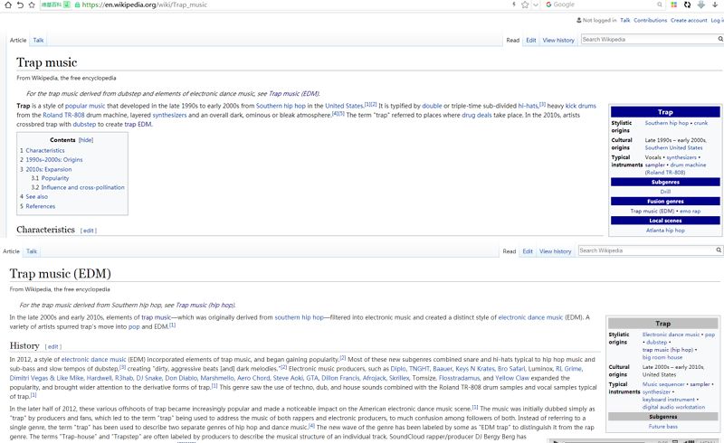 不过就在近几天,英文维基百科终于对Trap Rap以及EDM Trap加以区分。原本的Trap Music词条被区分为Hip-Hop项的其一以及EDM项的其二。粉丝也可以通过下面简单的截图看到维基百科将两种不同的音乐风格分开的事实。