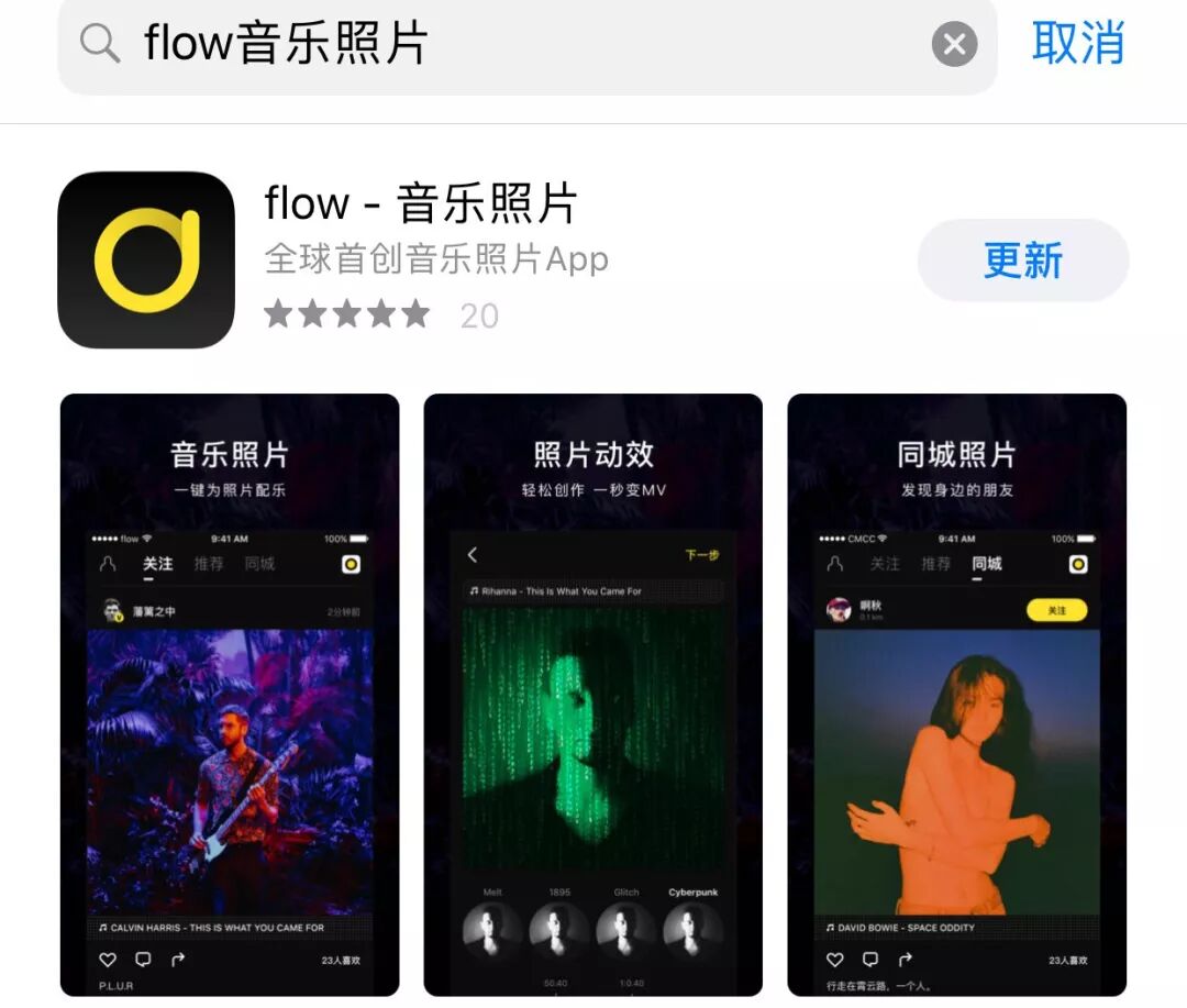 在Instagram的带领下,枯燥的纯文字或许已经无法满足现如今New-School的社交网络市场。人们总希望将图片作为短时间内夺人眼球的重点。而flow主张的音乐照片创意,正是让照片生动起来,通过音乐和动态效果,锦上添花。