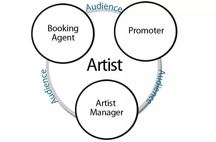 ⒌巡演经纪:Booking Agency。销售艺人的演出,或者说他们直接意味着接管了艺人演出的预定权限。夜店、音乐节或者其它形式的演出,主办方都必须通过Booking Agency付费邀请艺人。不一定使用抽成制度,很多Booking Agency赚取差价。
