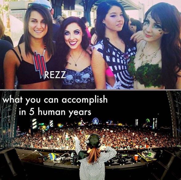 Rezz曾经在接受采访的时候告诉过媒体,Deadmau5和Skrillex是她入行的原因以及启蒙者。而在LA的这场音乐节中,Deadmau5和Skrillex均有登台演出。五年前的她还只是餐厅的打工者,她省吃俭用当了一回Raver,而这场活动竟然“挖掘”了现在的Rezz潜能。