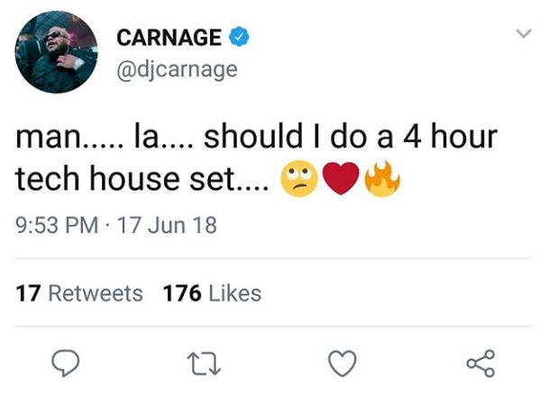 但是,就在2018年6月17日,即最近。Carnage在推特上宣布,他将在LA的演出呈现一场不一样的DJ Set,播放四小时Tech House。这可能是Carnage首次踏足Tech House领域,也“跟风”尝试Techno/Tech House领域常追求甚至热衷的Long Set玩法。值得鼓励。