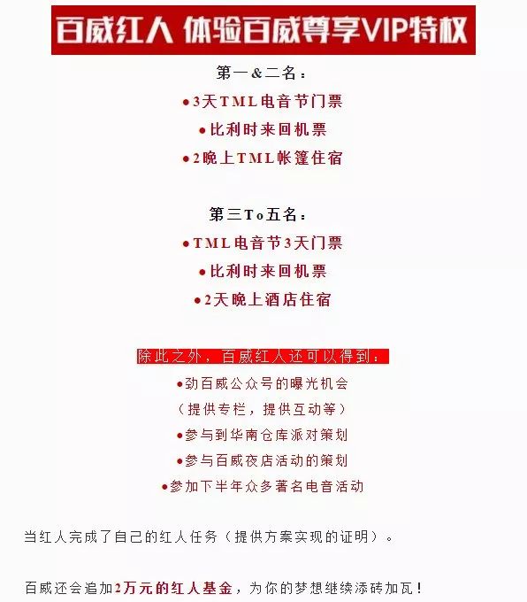若成功成为“百威红人”,你将获得令其他乐迷羡慕的厚礼。除了Tomorrowland的圆梦旅程以外,还将有望获得百威官方公众号《劲百威》的曝光机会、成为活动策划者、额外的2万元红人基金等等。详情见下图。