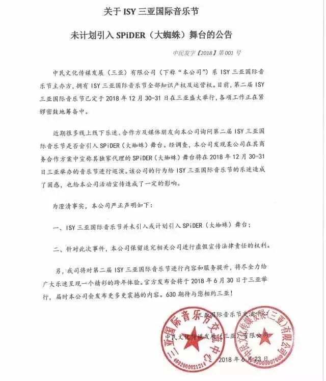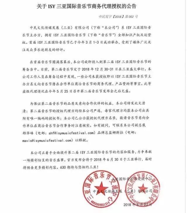 除此之外,更有许多规模不大的、你不一定听说过的公司,伪造与ISY三亚国际音乐节的合作关系。并以“合作方”的身份,在行业内试图获取更多商业盈利机会。ISY官方自然不会睁一只眼闭一只眼,他们同样及时作出了制止,以及保留法律追究权利。