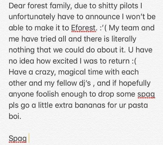 Spag Heddy本次缺席的是国际知名音乐节Electric Forest。他解释到,由于航班问题,他与他的团队想尽办法进行沟通,但是依然无法将问题解决。Spag Heddy称,他非常希望参与这场音乐节,但也表示可惜。说到底,他已经无法赶上这场演出。