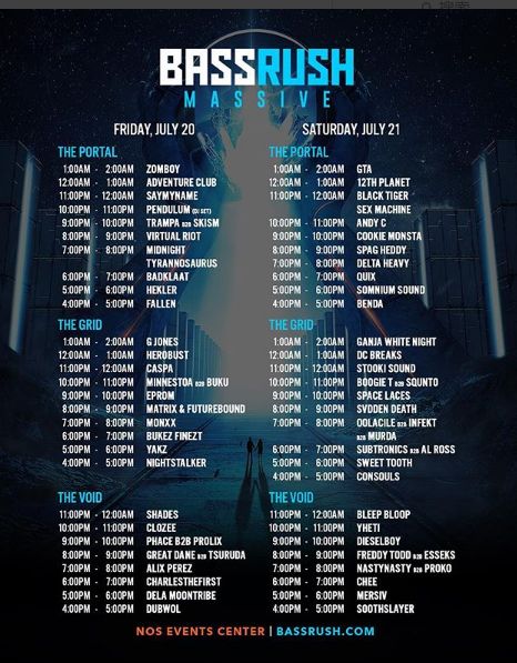不同于Bassrush举办的仓库派对和Club Shows,也不同于Bassrush在EDC上的独立的舞台,Bassrush Massive是正儿八经在美国加利福尼亚州圣贝纳迪诺的室外数万人规模场地举办的。时间为7月20日~7月21日。