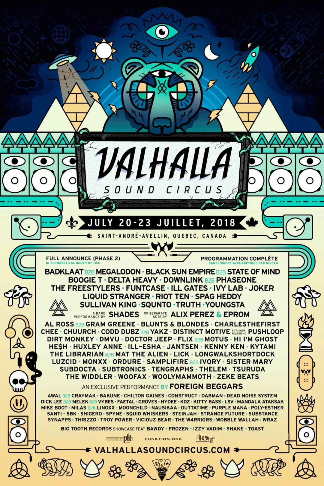 撞期⒊Valhalla Sound Circus,在7月20日~7月23日举行,为期四天。其举办地为北美Bass Music氛围强烈的加拿大魁北克省。自2012年创立以来,Valhalla Sound Circus强调在森林举办,也是为了让乐迷们更好地接触大自然以及野外跳舞场景。