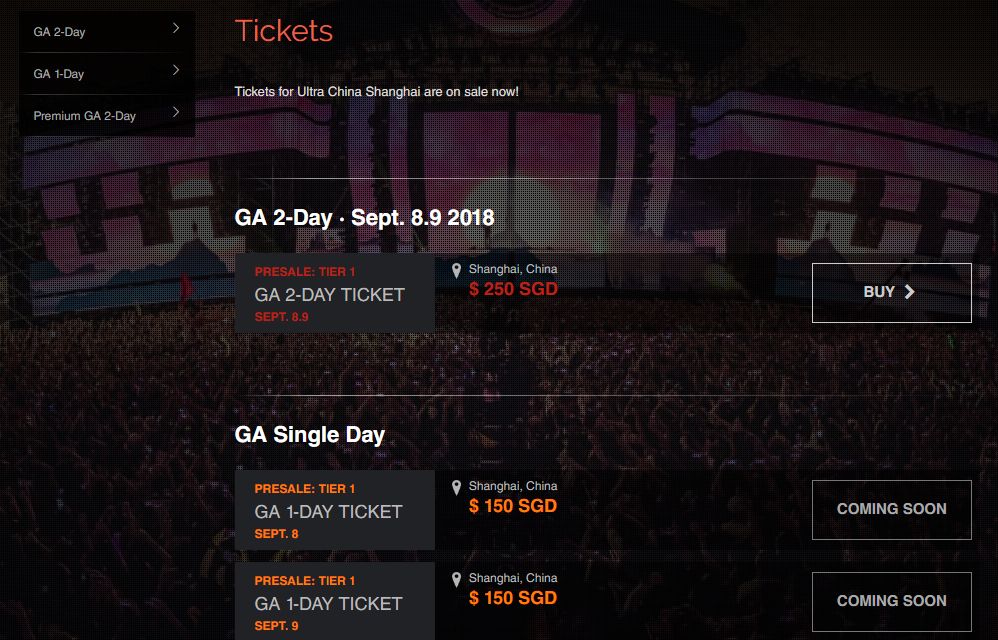 最后,希望Ravers可以选择官方授权售票平台购票,以免造成官方无法负责的损失。暂时已公布的官方授权票务平台有大麦网、猫眼、FestGround。大麦与猫眼的预售票一秒售罄。但Ultra China官网“https://ultrashanghai.com/tickets/2018/”仍有少量余票。