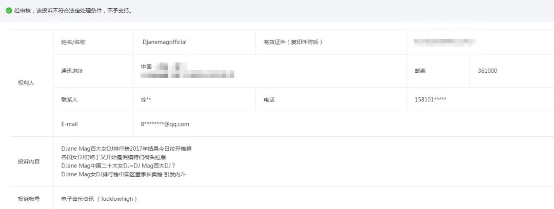 ⒋如果DJane Mag中国区继续做出有损《电子音乐资讯》品牌或者恶意投诉的行为,《电子音乐资讯》将以公司名义发起诉讼,或递交律师函。