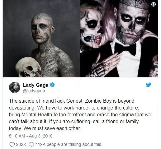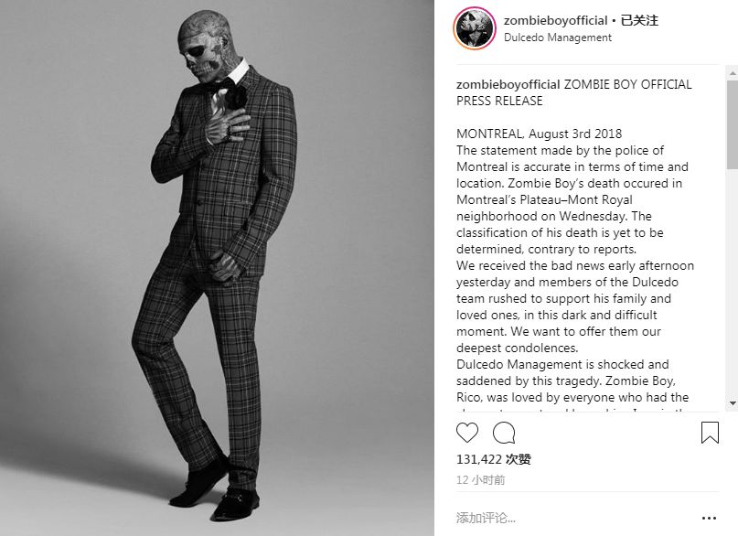 就在昨天,经多家西方媒体报道,Rick Genest于2018年8月1日在家中自杀,死于32岁。Rick Genest又被称之为Zombie Boy,即“僵尸男孩”,Rick Genest是一名超知名模特,以从头到脚、布满全身的纹身而闻名并独树一帜,受众多大品牌青睐。