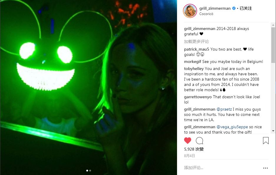 而在前段时间的动态中,Kelly Lyn Zimmerman也揭露了她从2014年开始便已经是Deadmau5的粉丝。四年前Kelly Lyn Zimmerman只是以粉丝身份出现在Deadmau5的现场,而时隔四年的现在,Kelly Lyn Zimmerman却与Deadmau5一起出现在舞台上。