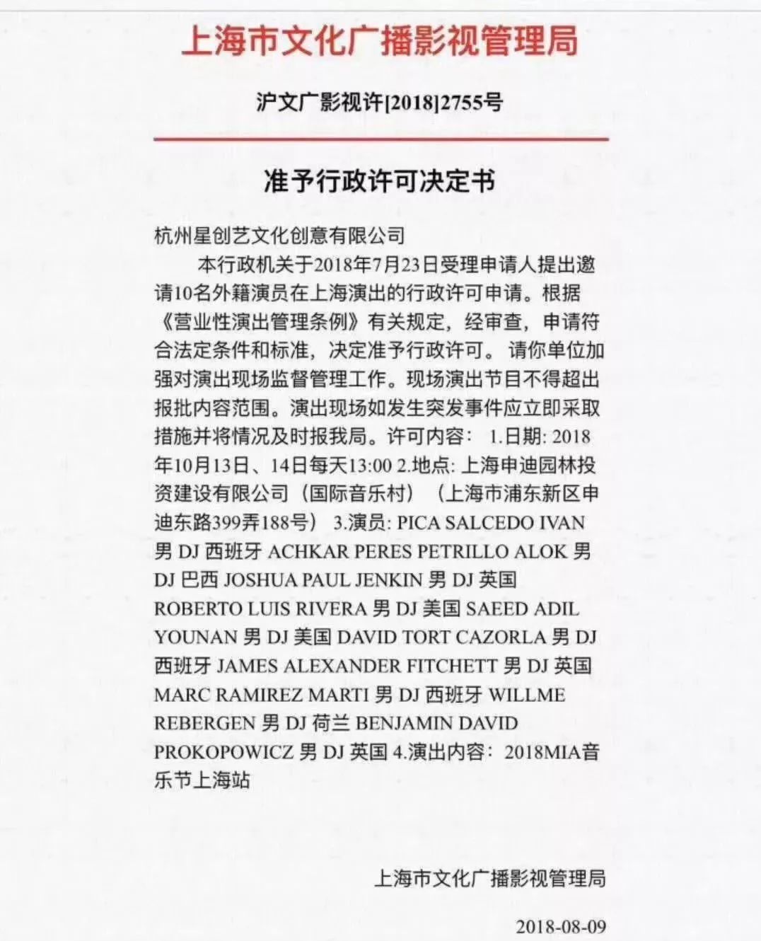 虽然在MIA Music Festival的官宣中并没有点明举办时间,但批文却透露了今年MIA Music Festival中国站将在10月13日~10月14日举办。对于Techno爱好者来说,已知阵容简直可以说是一份大礼。对于EDM爱好者来说,若小道消息流露的Calvin Harris不假,定会是一起即将轰动一时的大新闻。