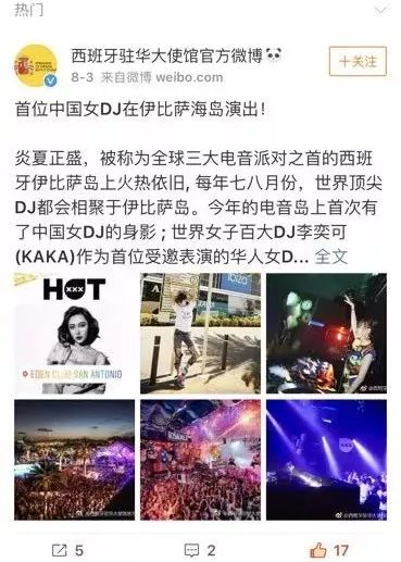 更有趣的是,前不久,“西班牙驻华大使馆”的认证微博,也报道了DJ KAKA在Ibiza演出事件,并直接点明“首位中国女DJ在Ibiza海岛演出”。可以说十分权威了。中国电子音乐文化在国际上的发展,一步一脚印,离不开所有人的努力,谁都不只是孤军奋战。一切都被记录着。